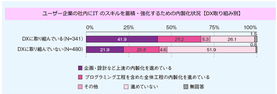 白書では、DXに取り組んでいる企業と、そうでない企業に分けて取り組み事例が紹介されていますが、今回は「DX推進企業における内製化状況」を注目して取り上げたいと思います。