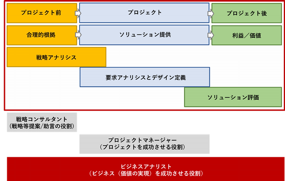 そしてビジネスアナリストは「戦略分析~価値の実現を成功させる」までの幅広い領域の役割を担っている点が特徴です。