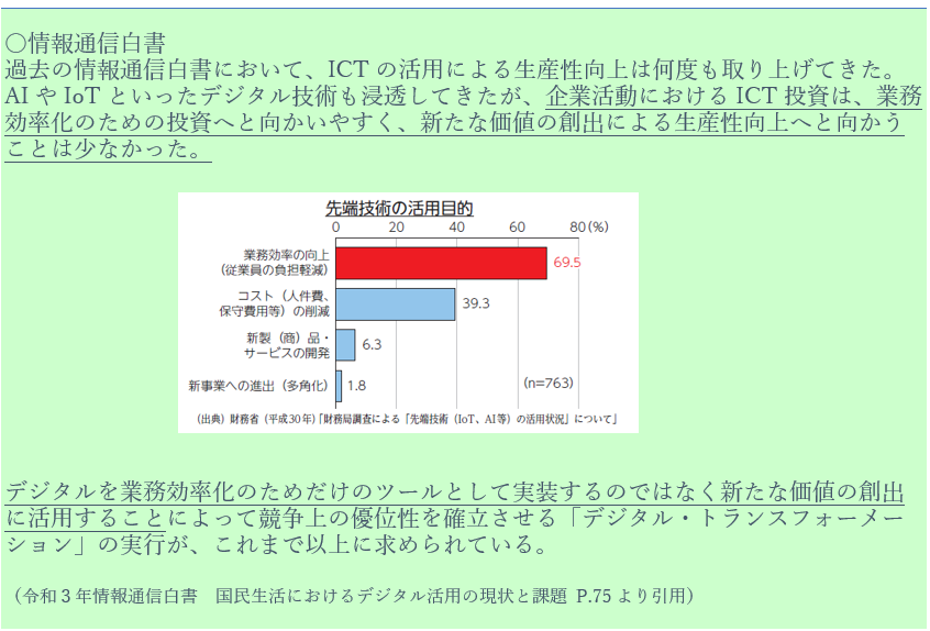 そして今年度の情報通信白書のポイントとして、生産性向上の課題とDXとの関係性が取り上げられています。現状、企業活動におけるICT投資の目的は「業務効率化」が中心ですが、「新たな価値の創出」の視点を加えたDX推進によって、より生産性を向上させることが求められています。