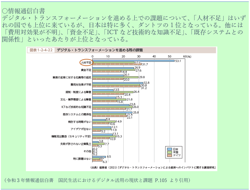 続いて企業のDX推進における課題について2つの白書の共通点を見てみたいと思います。以下は情報通信白書より「企業のDXを進める際の課題」の調査結果ですが「人材不足」の課題がダントツの1位となっています。