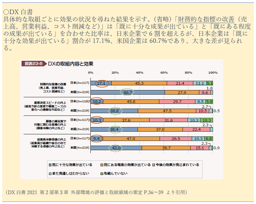 DX白書のなかでもDX取組における効果が取り上げらえています。DXは財務的な指標(売上高、営業利益、コスト削減など)の改善をはじめ企業に効果をもたらしています。しかし米国企業と比較すると十分な効果を実感している日本企業の割合はまだまだ少ないことがわかります。