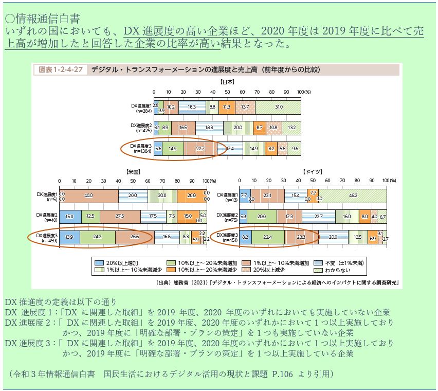 情報通信白書では、企業のDXの取組みの度合い(DX進展度)と売上高との相関関係が紹介されていました。DX進展度の高い企業ほど売上高が増加した企業の比率が高く、DXで得られた原資が企業の競争力と経営体力を高め、コロナ禍の環境変化のなかでも売上高を高めることにつながる要因の1つになったと推測できます。