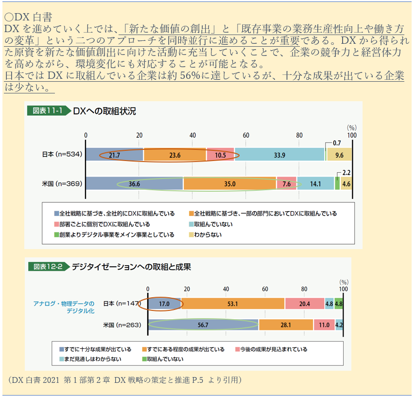 そしてDX白書でも、現状の日本企業はDXの取組状況、DXの十分な成果がでている割合が米国に比べて少なく、「新たな価値の創出」と「既存事業の業務生産性向上や働き方の変革」の2つのアプローチを同時並行に進めるDXの重要性が取り上げられています。