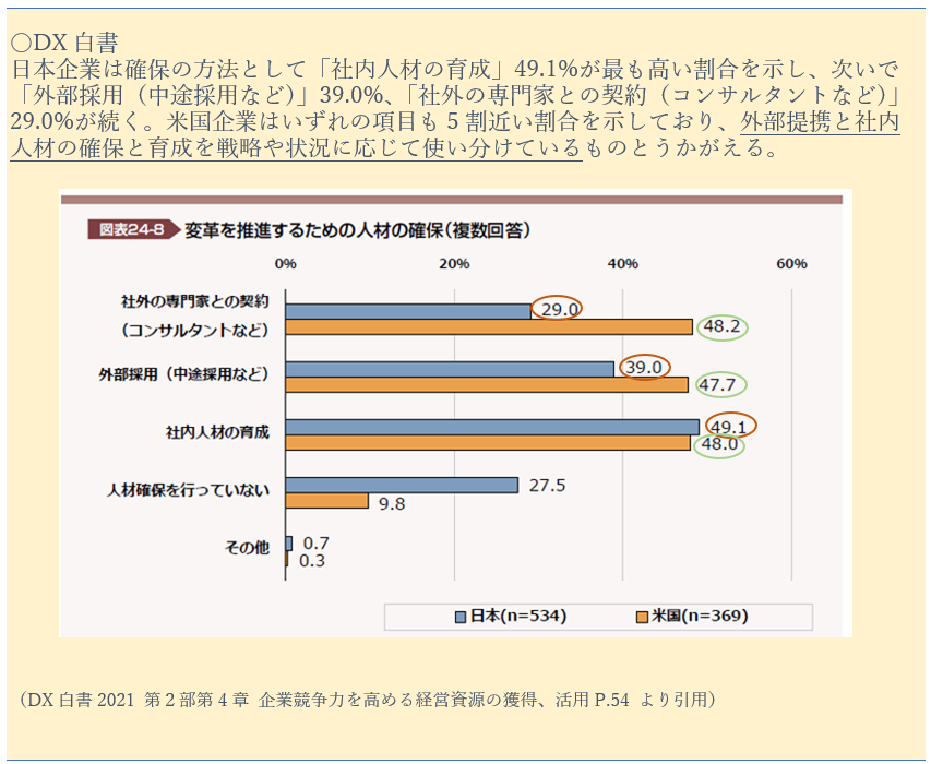 一方DX白書では、人材不足の課題に関連してDX人材の確保の方法が取り上げらえていました。社内人材の育成のほか、外部人材(社外専門家、外部採用など)を積極的な活用も課題解決の方法の1つとなりそうです。