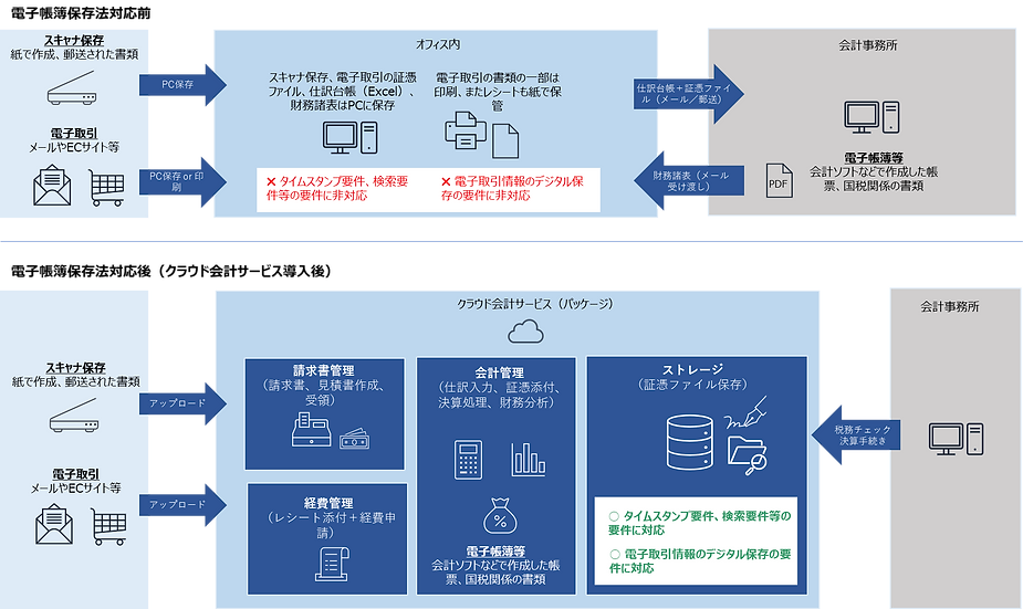 とくにクラウド会計サービスはタイムスタンプ要件、ファイル検索要件等の電子帳簿保存法の要件への対応がすべてパッケージ化されたサービスが多く